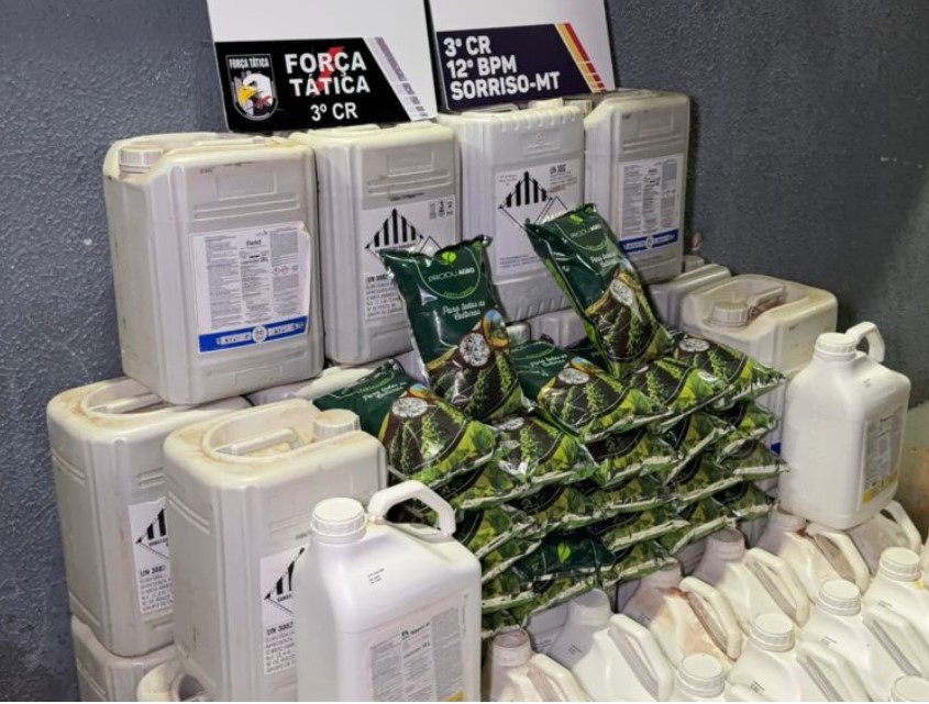 O homem e a mulher, idades não informadas, foram detidos após armazenarem sacos e galões de defensivos agrícolas em local inadequado e em desacordo com normas de segurança em uma quitinete do bairro Colinas, no último sábado à noite (28). A Polícia Militar não informou a quantidade de material apreendido, mas preliminarmente foram mais de 20 galões.