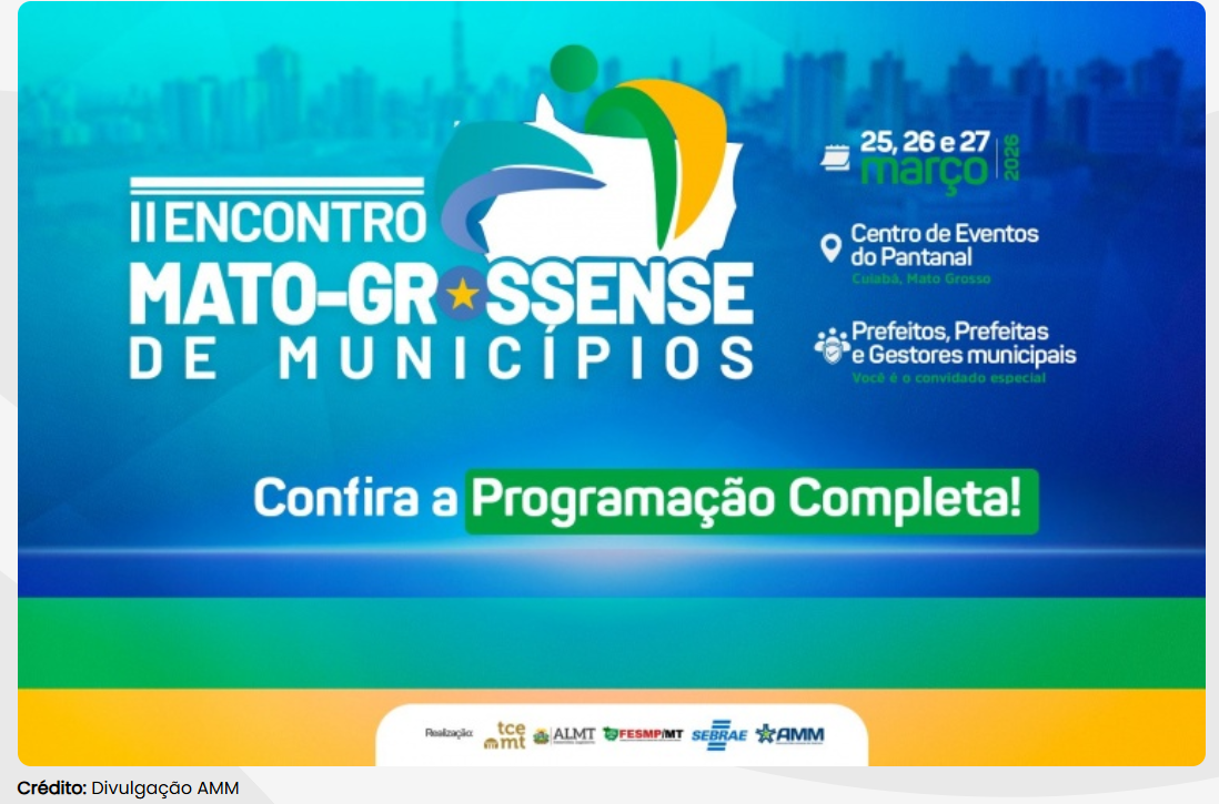 O encontro será promovido pela Associação Mato-grossense dos Municípios (AMM), Tribunal de Contas de Mato Grosso (TCE-MT), Fundação Escola Superior do Ministério Público (FESMP) e Sebrae. Já estão confirmadas as presenças da senadora e ex-ministra da Agricultura, Tereza Cristina, do governador Mauro Mendes, do presidente da Associação Brasileira de Comunicação Pública, Jorge Duarte, entre outros. Mais informações na página oficial do evento: https://encontro.amm.org.br/